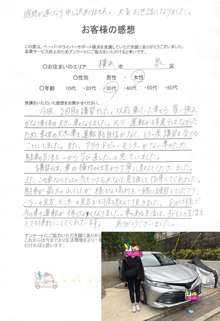 米国での駐在が決まり、現地では車に乗る必要がある為、ペーパードライバーサポート横浜様を受講させて頂きました。免許を取得して10年以上が経過しているものの数回程度しか運転したことがなく、エンジンのかけ方もわからない程でした。全5回の講習を受けましたが、基本的なことから路場での運転、駐車の仕方などなど丁寧に教えていただき、1人で運転できる状態にして下さいました。これまでなにを気をつけていいのかわからずひたすら怖いと思っていたこともコツや注意するべきことを教えてもらったことで安心して運転できるようになりました。ありがとうございました! |