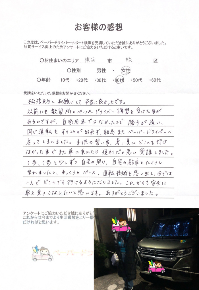 松信先生にお願いして本当に良かったです。以前にも教習所のペーパードライバー講習を受けた事があるのですが、自家用車ではなかったので勝手が違い同じ運転をすることが出来ず、結局またペーパードライバーへ戻ってしまいました。子供の習い事、暑い夏にどこへも行けなかった事でまた車に乗れたら便利だと思い受講しました。1歩、1歩と少しずつ自宅の周り、自宅の駐車とたくさん乗れましたし、ゆっくりのペース、運転技術を思い出し、今では一人でどこへでも行けるようになりました。これからも安全に車を乗りこなしたいと思います。ありがとうございました。 |