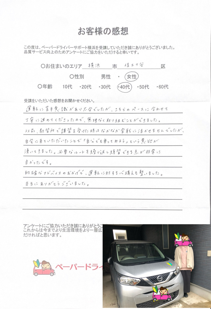 この度はご丁寧なご指導を賜り、御礼申し上げます。基礎の基礎からしっかりと分かりやすく、また小さな課題の達成や上達に対して毎回その都度褒めていただき、ちゃんと上達できているという実感と自信を持つことができました。注意点に関しても的確に指摘していただいたおかげで予想よりも短期間で運転スキルを磨くことができました。また、自家用車の設備の使い方や、帰省時の車でのルートやオススメの日時や時間帯のアドバイスもいただき本当に助かりました。これからもご指導いただいた妻共々、教えていただいたことを忘れずに安全運転を心掛け、車を有効に活用していきたいと思います。重ねて、心より感謝申し上げます。本当にありがとうございました。 |