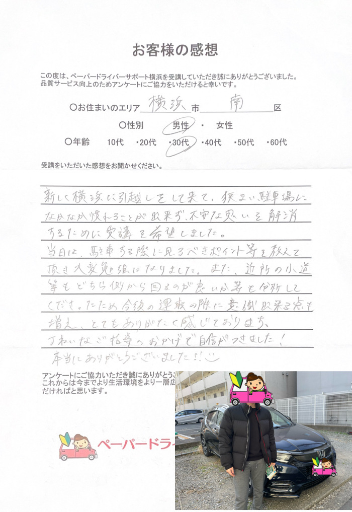 子どもが産まれ運転が必要になり、ペーパードライバーサポート横浜さんへ辿り着きました。1時間〜1時間半を3日に分けて受講しました。運転をしなくなって10年のブランクがあり、運転席に乗るだけで緊張していた私ですが、教官さんの丁寧なご指導により、まだまだではありますが、運転ができるようになりました。今では夫をのせ平塚から自宅まで運転をしたり、弟や母を実家へ送るといった短距離であれば1人でもできるようになりました。教官さんに教わったとおり、1週間に1時間だけでも続け慣れて行こうと思いました。お願いして本当に良かったです。ありがとうございました。感想遅くなり申し訳ありませんでした。 |