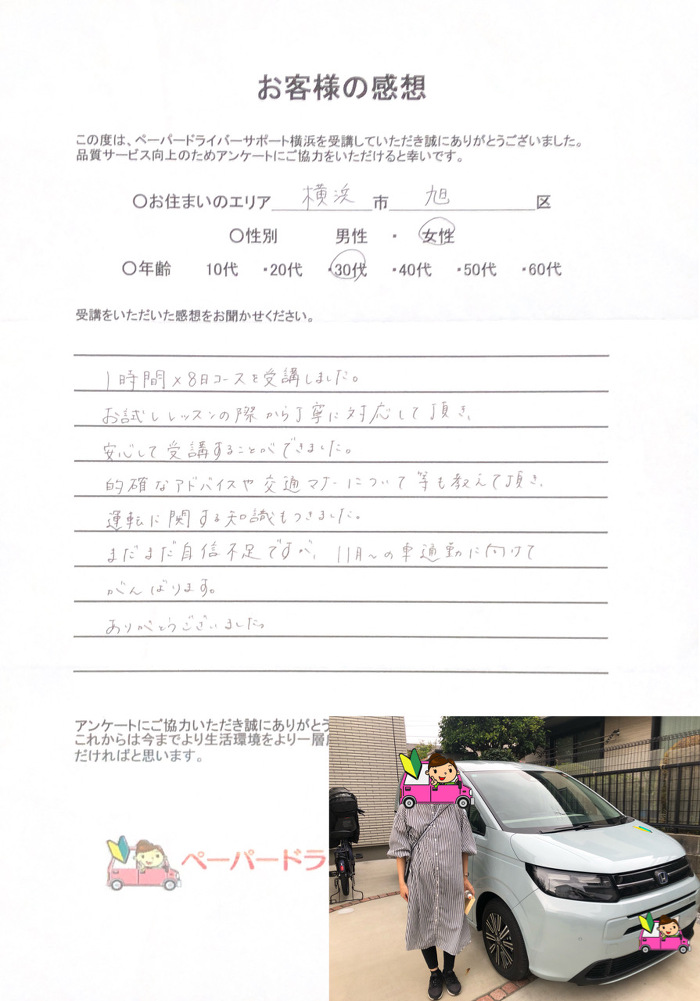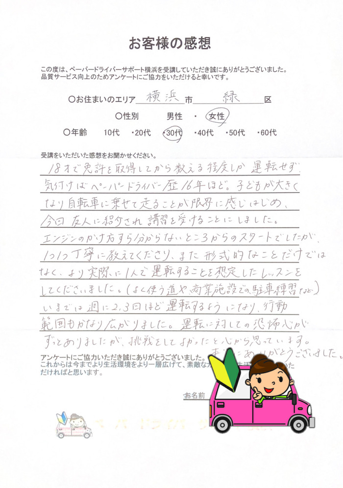 子どもが産まれ運転が必要になり、ペーパードライバーサポート横浜さんへ辿り着きました。1時間〜1時間半を3日に分けて受講しました。運転をしなくなって10年のブランクがあり、運転席に乗るだけで緊張していた私ですが、教官さんの丁寧なご指導により、まだまだではありますが、運転ができるようになりました。今では夫をのせ平塚から自宅まで運転をしたり、弟や母を実家へ送るといった短距離であれば1人でもできるようになりました。教官さんに教わったとおり、1週間に1時間だけでも続け慣れて行こうと思いました。お願いして本当に良かったです。ありがとうございました。感想遅くなり申し訳ありませんでした。 |