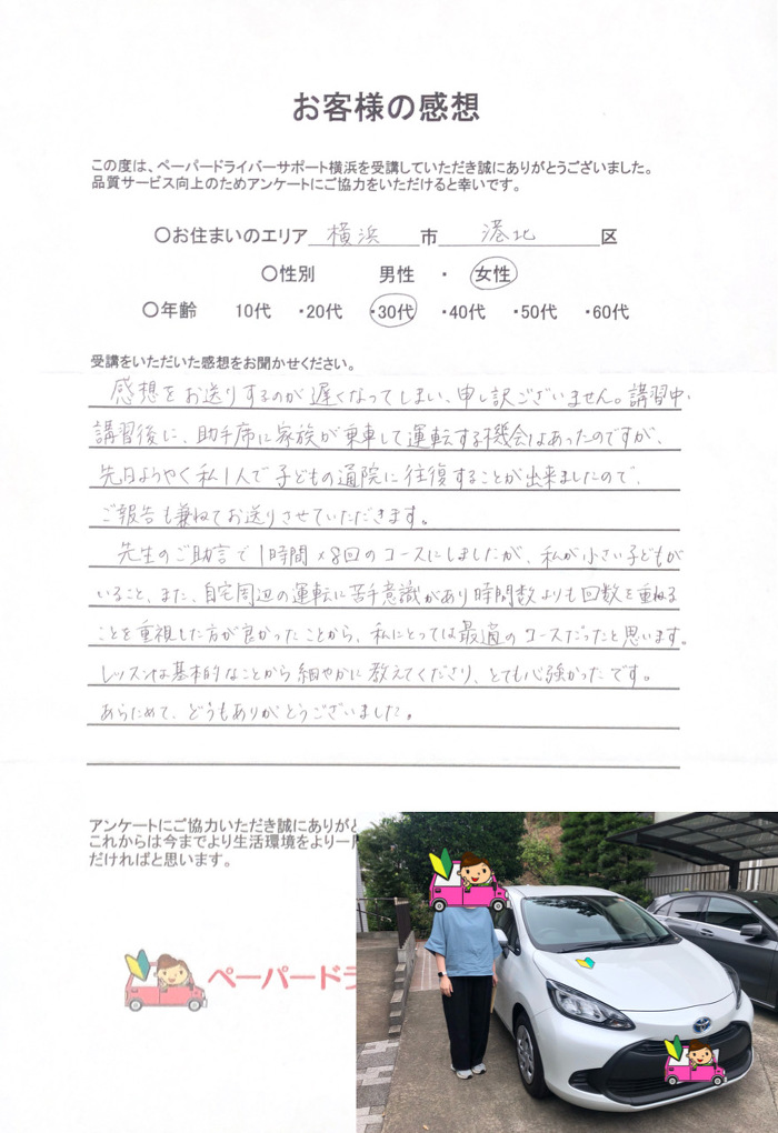 感想をお送りするのが遅くなってしまい、申し訳ございません。講習中、講習後に助手席に家族が乗車して運転する機会はあったのですが、先日ようやく私1人で子どもの通院に往復することが出来ましたので、ご報告も兼ねてお送りさせていただきます。先生の助言で1時間×8回のコースにしましたが、私が小さい子どもがいること、また、自宅周辺の運転に苦手意識があり時間数よりも回数を重ねることを重視した方が良かったことから、私にとっては最適のコースだったと思います。レッスンは基本的なことから細やかに教えてくださり、とてと心強かったです。あらためて、どうもありがとうございました。