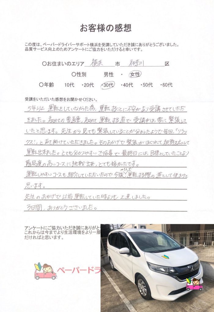 米国での駐在が決まり、現地では車に乗る必要がある為、ペーパードライバーサポート横浜様を受講させて頂きました。免許を取得して10年以上が経過しているものの数回程度しか運転したことがなく、エンジンのかけ方もわからない程でした。全5回の講習を受けましたが、基本的なことから路場での運転、駐車の仕方などなど丁寧に教えていただき、1人で運転できる状態にして下さいました。これまでなにを気をつけていいのかわからずひたすら怖いと思っていたこともコツや注意するべきことを教えてもらったことで安心して運転できるようになりました。ありがとうございました!