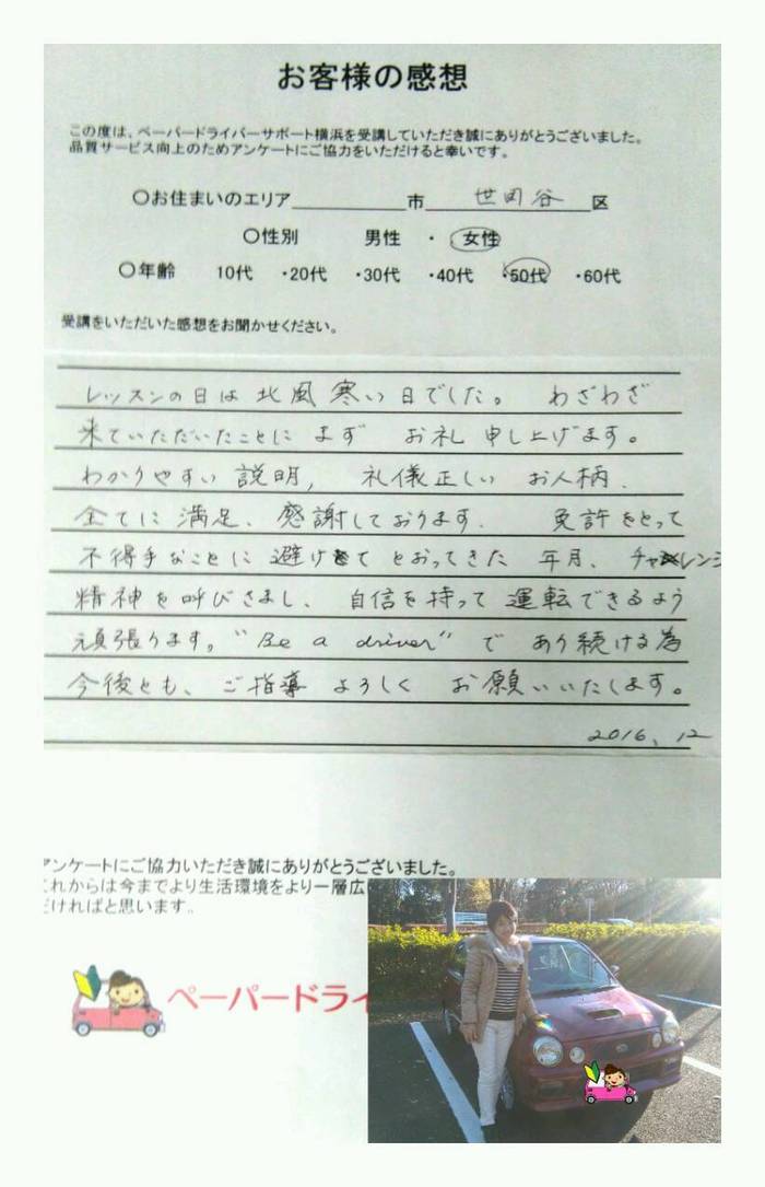 この度は短期間でしたが大変お世話になり、ありがとうございました。約16年ぶり、免許取得後運転をほとんどしてきませんでしたが、それでも!車の運転に抵抗がなくなった事は本当に嬉しい結果です。